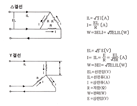 선간전압 E(V)의 평형 3상교류 회로에 DELTA(Δ) 또는 STAR(Y) 결선한 경우의 전압, 전류, 전력의 관계는 아래와 같다.